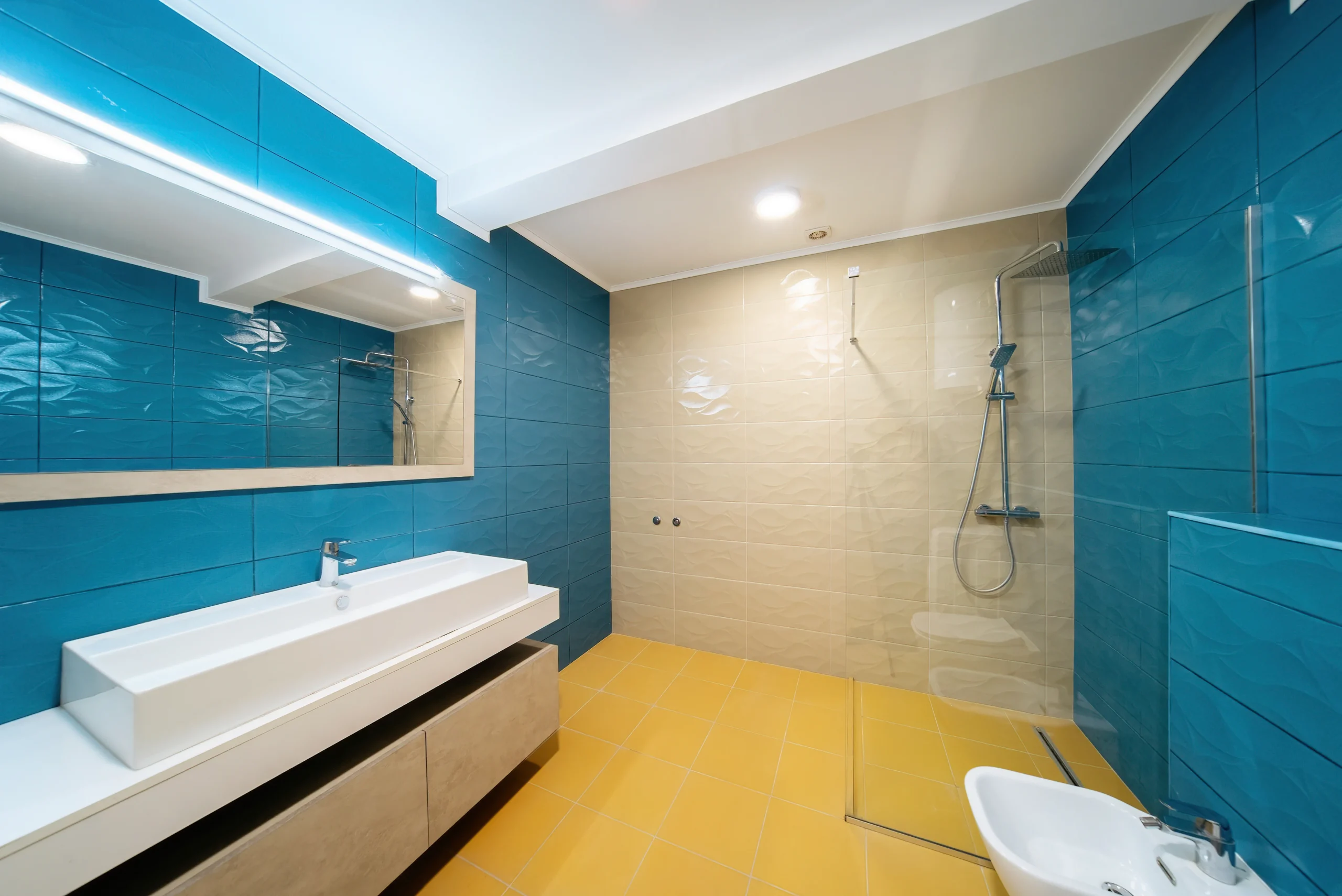 The layout includes a bright living room, a comfortable seating area, and a private balcony. The apartment is equipped with air conditioning and finished with quality materials. The bathroom features a walk-in shower, bidet, and separate toilet, with hair dryers and bath accessories included.